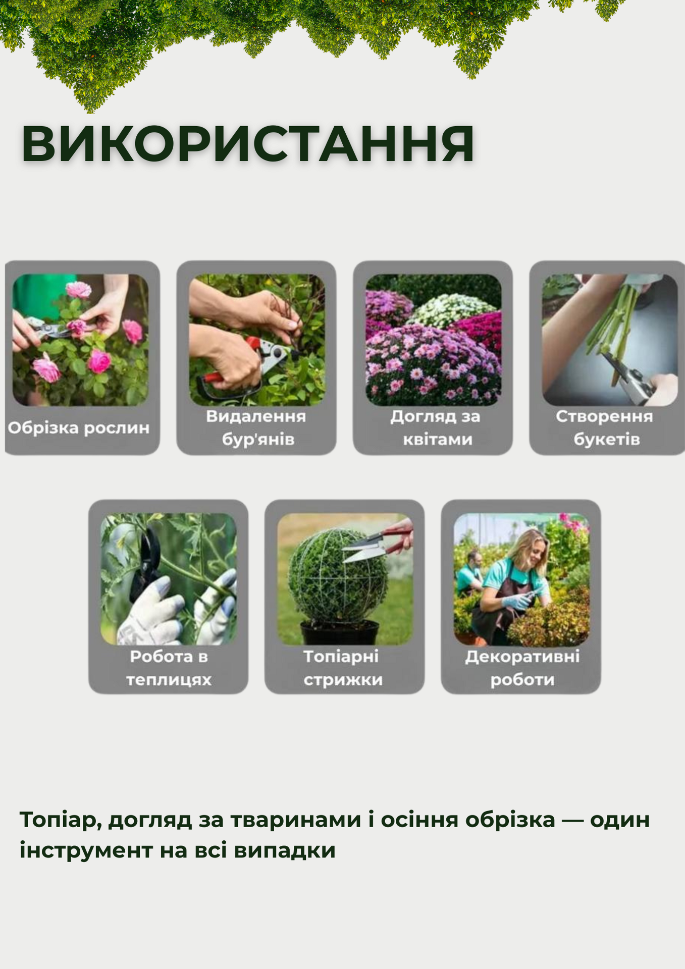 Один інструмент — десятки задач: обрізка кущів, сезонне формування крон і навіть догляд за домашніми тваринами. Особливо корисні восени, коли рослини потребують оновлення.